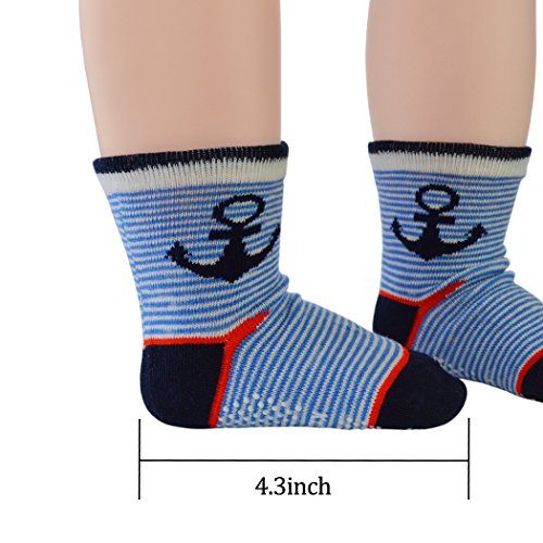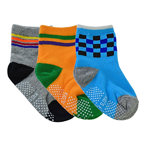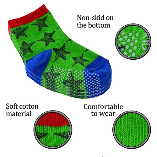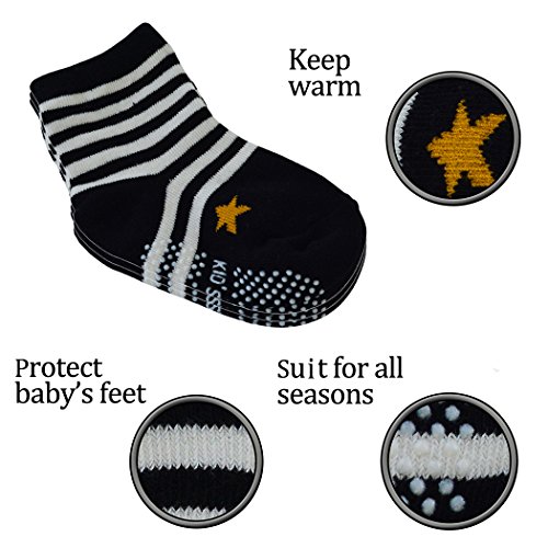 PROTECT YOUR BABY! These knitted anti-slip toddler socks are perfect for the fussy baby that kicks off their socks! They are great socks that allow plenty of room to grow into.So they will keep you a while, anti-slip bottom prevent fall down for your toddler from smooth wood floors. They are just adorable and the white-dotted skid proof bottoms to make them great for baby feet and start to walk. If you are looking for a baby gift or have a toddler of your own, this pack is great because of the variety of colors and patterns and the light breathable material. The bright colors are sure to stimulate babies and draw their attention to those little toes. They are easy to get on and older toddlers are probably big enough to dress their little feet all by themselves, helping Mom out. 0