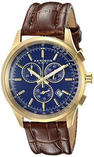 Studio : TWI Watches, LLC Publisher : TWI Watches, LLC Binding : Watch Product Description This AKRIBOS XXIV timepiece showcases a powerful and prestigious boardroom design: a 42mm yellow gold-tone solid stainless steel case with a polished finish powered by an ISA Swiss quartz chronograph movement. The dial is home to hand-applied stick markers and three sub-dials: a 30 minute tracker, small seconds, and two date indicators. The beautifully domed crystal slightly magnifies the dial, and the case is adorned with a brown crocodile embossed genuine leather strap. 0