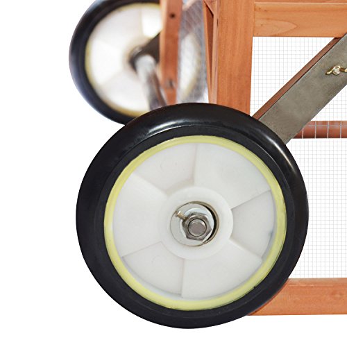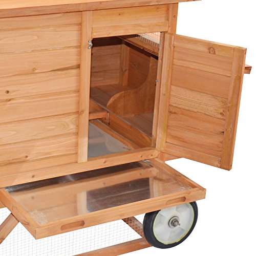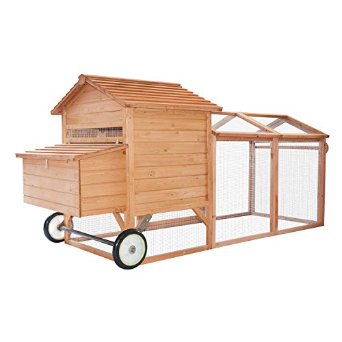 -. Feature : Large outdoor run for optimal space to roam / Wood is well ventilated but keeps your chickens warm and comfortable / Wheels attached to one side for easy mobility / Assembly required, all necessary tools included / Overall dimensions: 97.75"L x 38.5W x 46.25"H