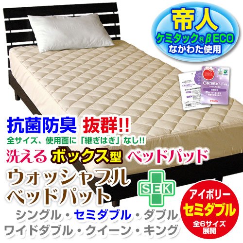 -. Feature : サイズ:セミダブル(120×200×30cm) カラー:アイボリー / 品質:表地裏地(ポリエステル65%・綿35%) 中わた(ポリエステル100%)帝人ケミタックわた 原産国:中国製(帝人ケミタックわた(原材料)は日本で製造したものを中国へ輸出し製品化してから、再び日本へ輸入した商品です) / 大人気商品「洗えるウォッシャブルベッドパッド」にお客様のアイデアを取り入れ、更にフィット感を高めるためのズレ防止用マチを付けた、ボックスシーツと中わた増量ベッドパッドがひとつになった「新機能付きベッドパッド」です。なかわたを従来品以上に機能性の高い「帝人ケミタック 抗菌防臭わた(SEKマーク付き)」にリニューアルしました。 / 汗臭さの原因となる細菌が繊維上で増殖するのを制御し、臭いの発生を抑える抗菌防臭効果を発揮。急性経口毒性試験、変異原性試験、皮膚刺激性試験など、様々な試験で安全性を確認しています。「SEKマーク」は(社)繊維評価技術協議会の基準で「抗菌防臭」検査に合格した原料のみに表示できる安心と信頼のマークです。 / 従来品はシングル、セミダブル以外のサイズに「はぎ(生地の繋ぎ目)」が入りましたが、当商品は使用面に「はぎ」のない仕上がりです。「はぎ」が無いことで見た目的にも美しく、生地の繋ぎ目が肌に触れる不快感がありません。程よいクッション性があり、裏は全周ゴム付きで着脱が簡単、洗濯可能(ネット使用)ですので清潔にご使用できます。