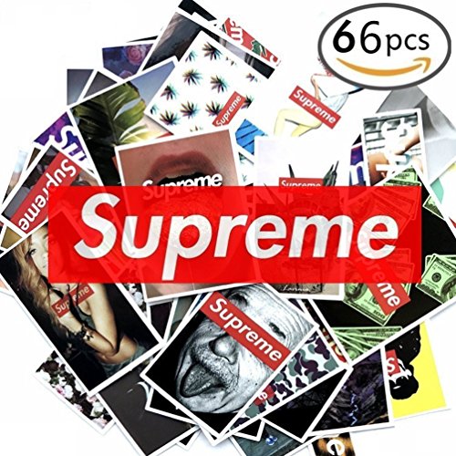- 66 NON-REPEATING SUPREME STICKERS - You will receive a package of 66 stickers per each individual order. These custom made assorted stickers vary in size ranging from 2 to 4 inches (or roughly 5-10 cm on their sides) and do not repeat.