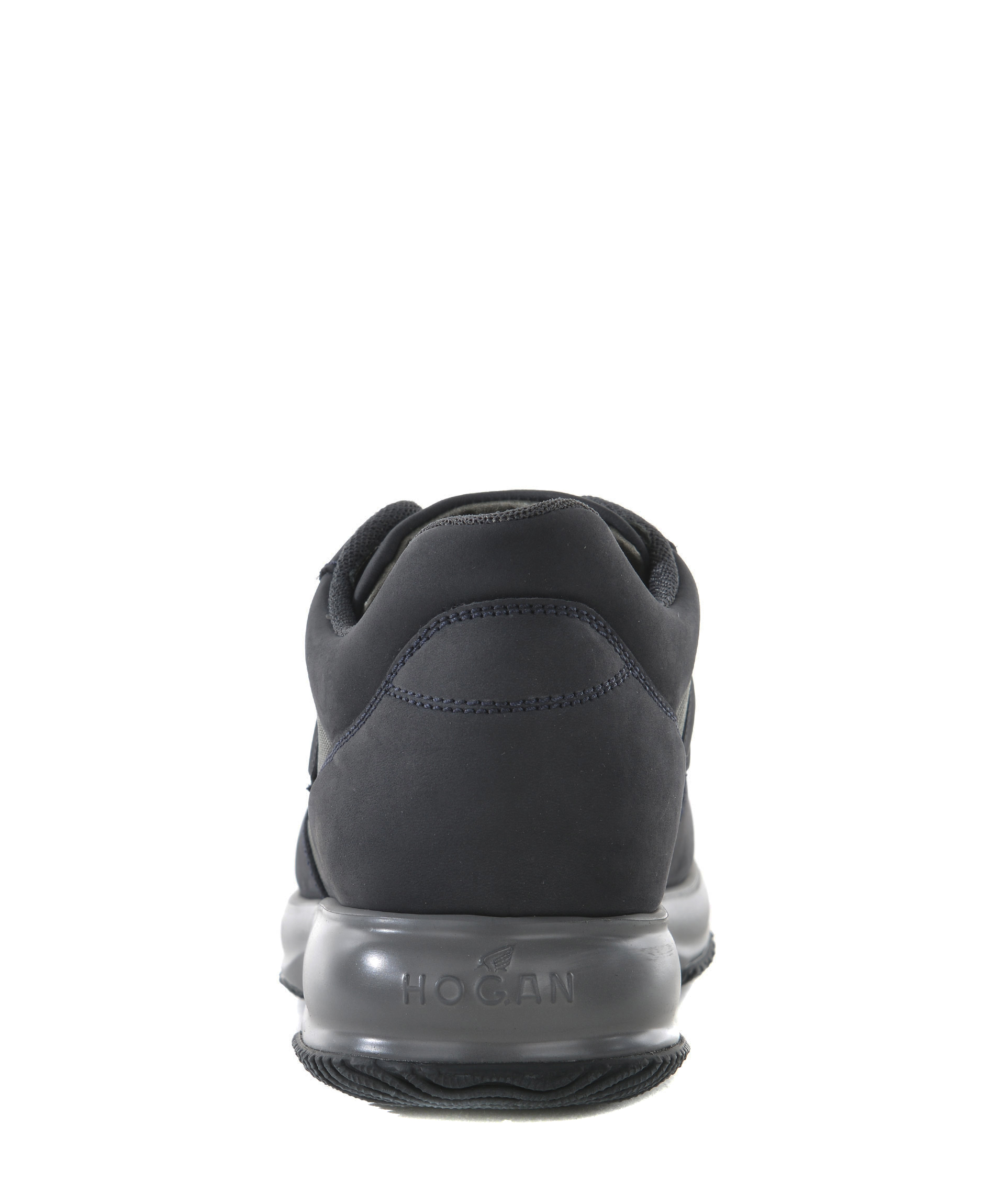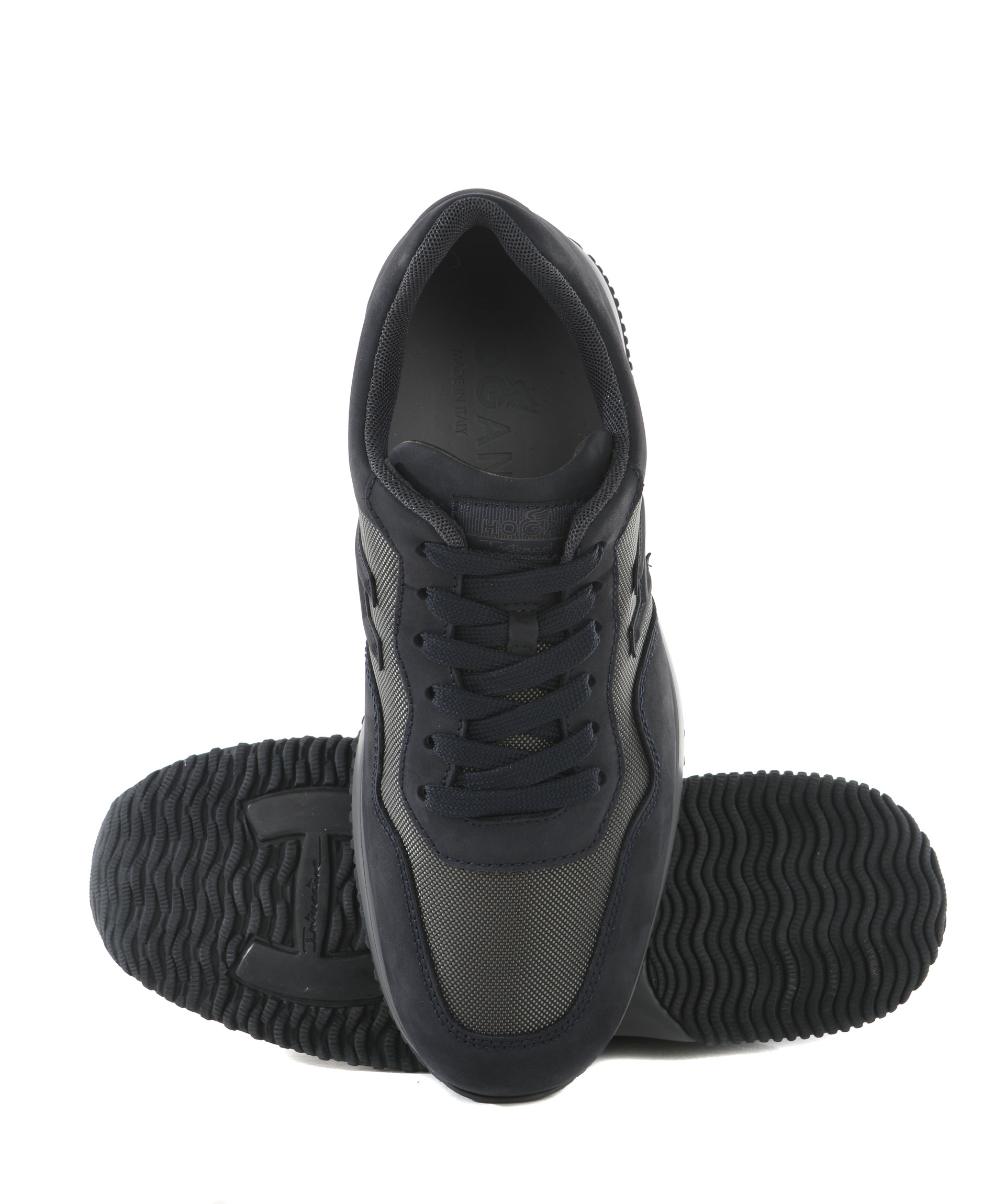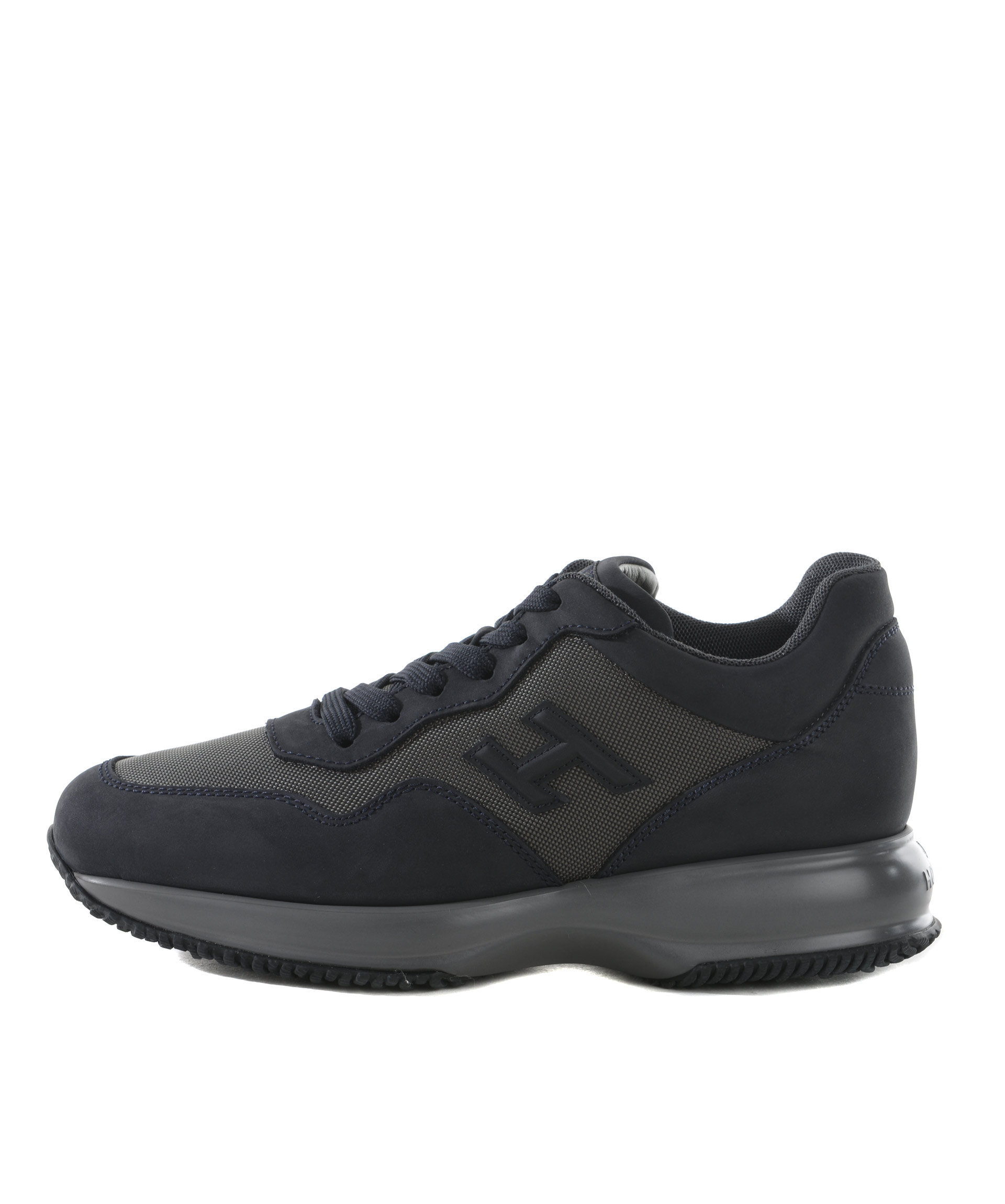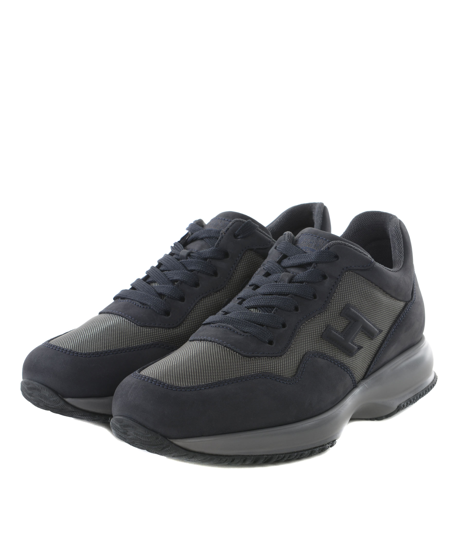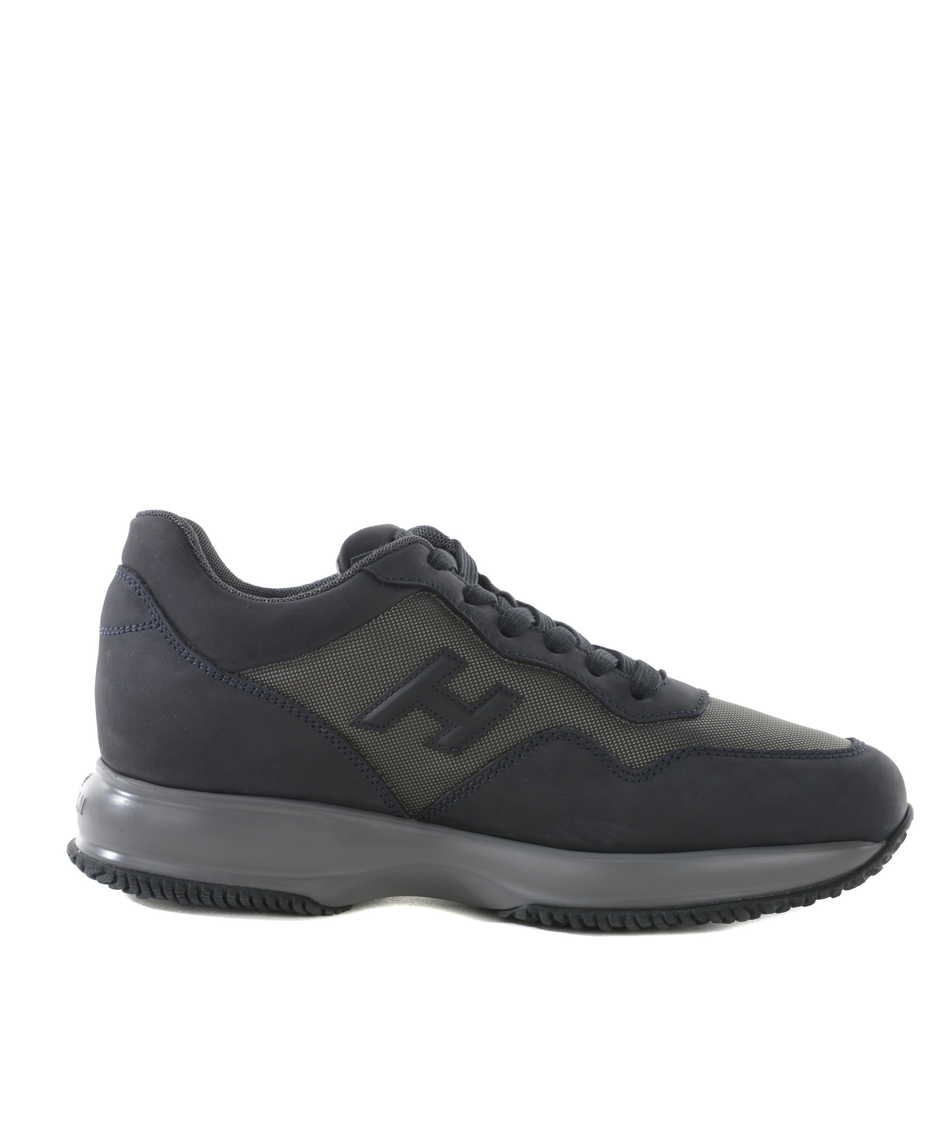 Sneakers Hogan in nabuk e nylon metallizzato Blu scuro/Piombo. H laterale applicata. Stringate. Patch logo sulla linguetta. Rialzo interno 20 mm. Suola 30 mm in gomma. Misura in foto 5