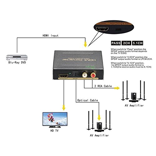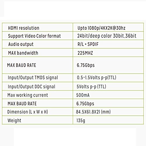 - SPDIF and L/R audio support output separately to amplifier without connecting TV/Monitor; Input resolution up to 1080p (50/60Hz), 1.3 HDMI, 3D
