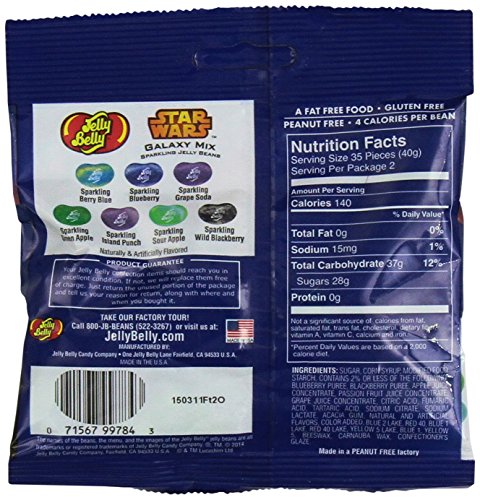 -. Feature : 2.8 oz Bag of Jelly Belly Star Wars Galaxy Mix Sparkling Jelly Beans / Star Wars 2.8 oz bags from Jelly Belly. Each bag features the iconic image of Darth Vader with his red lightsaber and feature a writing space for a personalized gift from Vader, himself. This imperial bag is perfect for traversing a galaxy far-far away or as a galactic party favor. / Flavors include: Sparkling Berry Blue, Sparking Blueberry, Sparkling Green Apple, Sparkling Sour Apple, Sparkling Grape Soda, Sparkling Wild Blackberry, Sparkling Island Punch / All Jelly Belly jelly beans are OU Kosher, gluten free, peanut free, dairy free, fat free and vegetarian friendly.