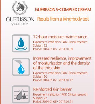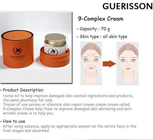 -. Binding : Misc. -. Brand : Guerisson 9 -. EAN : 0615953408249 -. Feature : Get 1 + 1 for less price / A cream to strengthen power to contain and keep moisture by covering gap of dead skin cells with pure seramideu it helps whitening and wrinkle care / Complex includes plentiful horse oil ceramaid to strenghen the ability of moisture retention and moisture ability / 9 kids of nature-derived ingredients: perpermint leaf, rosemary leaf, cabbage rose, lavender, apple mint leaf, sage leaf, lemon balm leaf, monarda didyma, monarda didyma leaf / German horse oil used -. PackageQuantity : 2 -. ProductGroup : Beauty -. ProductTypeName : BEAUTY -. Title : Guerisson 9 Complex Cream 70g +70 g Double (2 Pack Set) -. UPC : 615953408249
