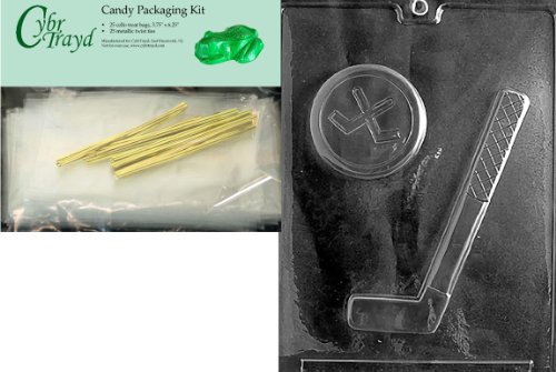 Cybrtrayd Mdk25G-S064 Hockey Stick and Puck Sports Chocolate Candy Mold, Includes 25 Cello Bags and 25 Gold Twist Ties