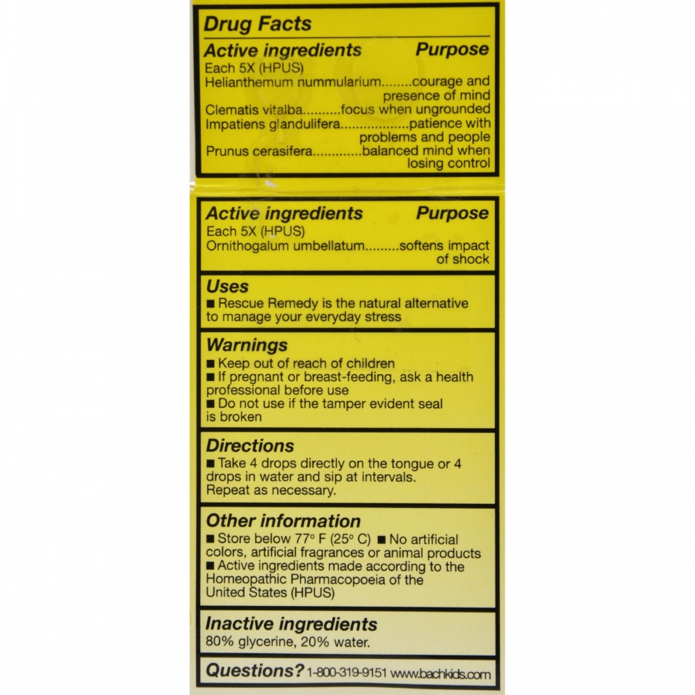 | Bach Flower Remedies Rescue Remedy Kids Description: Natural Stress Relief Parents love Bach because it is safe and natural and kids love the taste! Created to treat your child's emotions and restore balance, each remedy is part of a system of 38 Bach Flower Remedies developed by Dr. Edward Bach more than 70 years ago. Each kid-friendly remedy addresses a specific emotional state and used in 66 countries world wide. Disclaimer These statements have not been evaluated by the FDA. These products are not intended to diagnose, treat, cure, or prevent any disease.Ingredients : (each 5x[HPUS]), helianthemum nummularium, clematis vitalba, impatiens glandulifera, prunus cerasifera, ornithogalum umbellatum In80% glycerine, 20% water Size : 10 ML Pack of : 1 Product Selling Unit : each |