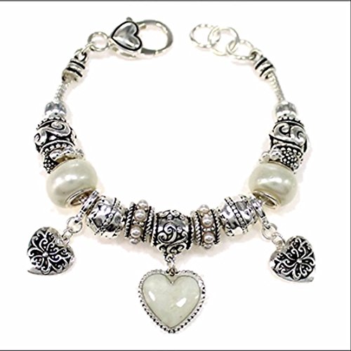 -. Feature : Heart Charms Pandora Inspired Multi Beaded Silver Tone Pearl Charm Bracelet / Beautiful Silver With White Glass Beads / Theme: Hearts Love Prom Girlfriend Present / 1.25" HEIGHT 7" LENGTH X 1" EXTENSION / Great Gift - Packaged in lovely gift box