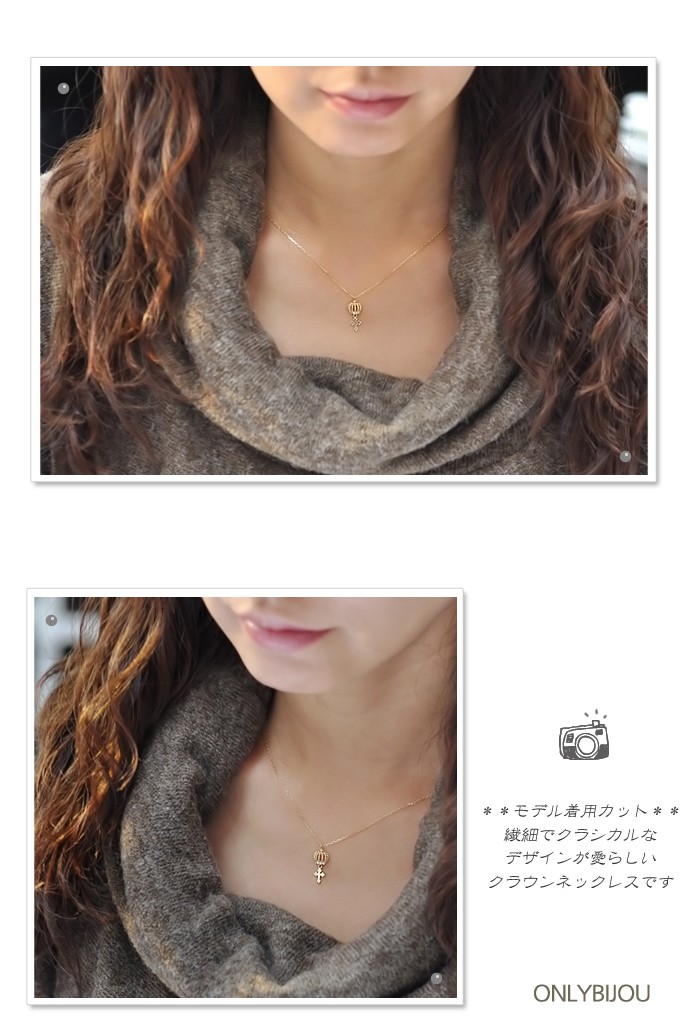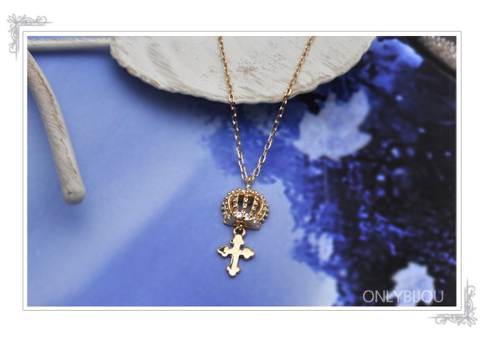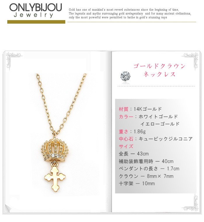※写真の商品カラーはイエローゴールドです。***シンプルで上質な愛らしいクラウンモチーフネックレス*☆*繊細な小さな王冠モチーフの下でクロスが静かに揺れる、フェミニン&クラシカルなデザイン★ホワイトゴールドカラーにキュービックジルコニアがさり気なく輝きます*。*※写真の商品カラーはイエローゴールドです。【サイズ】全長43cm、補助装飾着用時40cm/モチーフ全長1.7cm(クラウン 0.7mm、十字架10mm)【重量】1.86g【素材】14Kゴールド、キュービックジルコニア 【メーカー】onlybijou