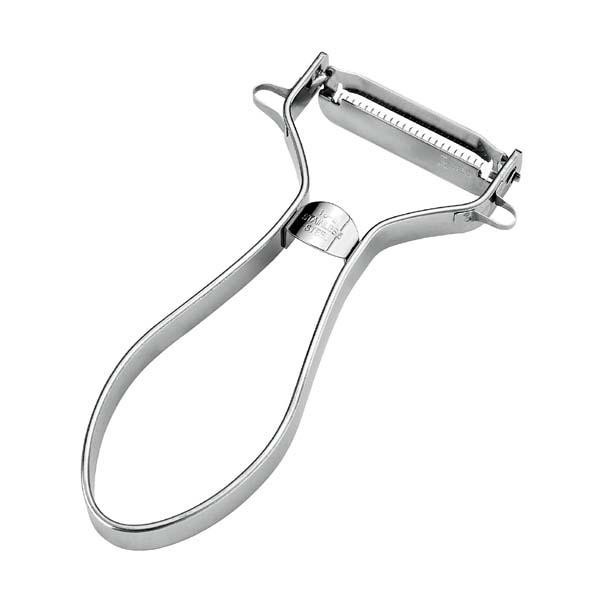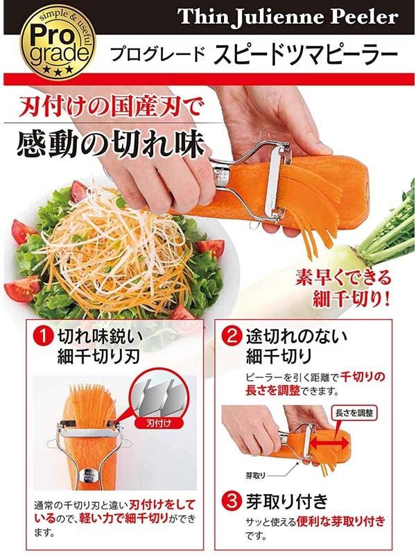 | 大根・人参・きゅうり等の野菜の千切りが力を入れずにラクラクできるピーラーです。ピーラーを引く距離で細千切りの長さを調整できます。便利な芽取り付き。 |