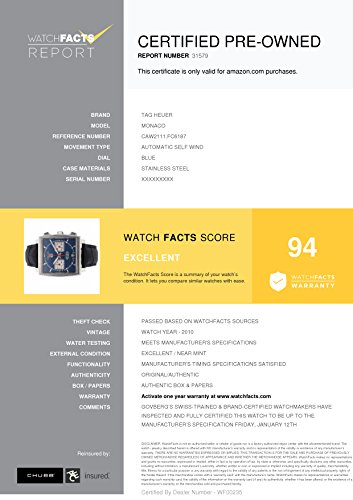 -. Binding : Watch -. Brand : TAG Heuer -. Department : mens -. Feature : Tag Heuer Monaco CAW2111.FC6187 with stainless-steel bezel and blue dial / Authenticated by WatchFacts. Grade Rating: 94 / Condition: Excellent / Comes with original box and manufacturer's papers offered with this watch / Automatic-self-wind movement / Watch year: 2010 -. Label : Tag Heuer -. Manufacturer : Tag Heuer -. MPN : A2HN- EWR90MONACO-II-CPO -. NumberOfItems : 1 -. PackageQuantity : 1 -. PartNumber : A2HN- EWR90MONACO-II-CPO -. ProductGroup : Watch -. ProductTypeName : WATCH -. Publisher : Tag Heuer -. Studio : Tag Heuer -. Title : Tag Heuer Monaco automatic-self-wind mens Watch CAW2111.FC6187 (Certified Pre-owned)