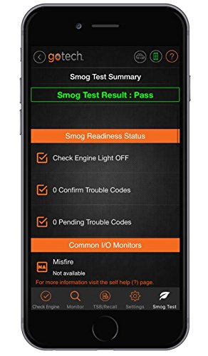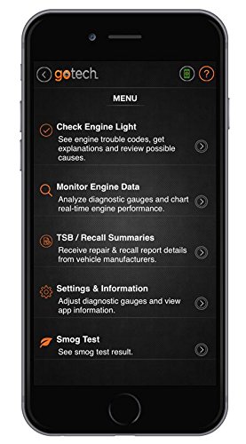 -. Feature : Transforms your Bluetooth enabled smartphone or tablet into a mobile OBDII diagnostic tool that can store data for up to 10 vehicles at a time / Perform vehicle smog test, scan vehicles, monitor performance in real time, define powertrain trouble codes, clear check engine lights / Access troubleshooting and repair tips from Master ASE-certified technicians from an extensive database that includes over 10-million possible causes / No app purchases, subscription fees or hidden costs; The app is free with the purchase of the GoTech Scan Tool / Designed for iPhone, iPad and Android mobile devices
