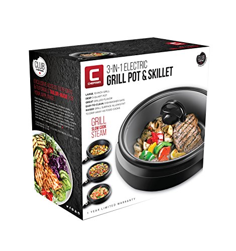 With the Chefman 3-IN-1 Electric Grill Pot & Skillet, there are endless options for hot, hearty and healthy dishes! The removable temperature control knob goes up to 450º F for versatility, while the cast aluminum cooking pot heats quickly and evenly, so you can make one-pot meals with ease. Large 10-inch nonstick cooking area and deep 3-quart pot offer a variety of cooking options; grill, slow cook, steam, simmer, stir fry and more! Raised grill surface allows fat to drip away as food cooks, so you get all the delicious tastes without the grease. As easy to clean as it is to cook with, the non-stick cooking pot, cool-touch housing, and tempered glass lid are removable and dishwasher safe. Make the most of your purchase with free access to Club Chefman for tailor-made recipes, videos, cookbooks and more! cETL approved with advanced safety technology for long-lasting durability, 30 Day No-Questions-Asked Money-Back Guarantee, & 1-year hassle-free warranty provided by Chefman. Grilling indoors has never been so easy!Feature