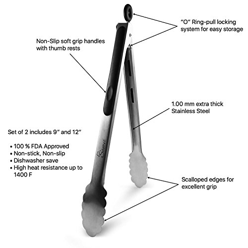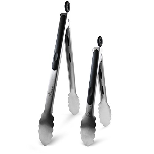 Samvi Kitchen Tongs Set Stainless Steel for Serving Cooking and Grilling BBQ and Salad Locking Tongs with Non slip grip Set of 2 Small and Large size 9" and 12"