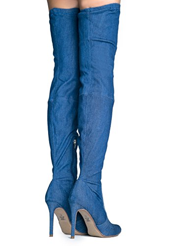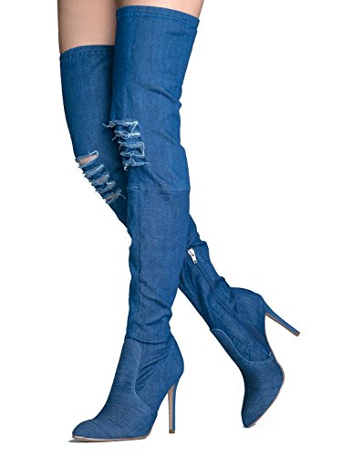 Binding : Apparel Product Description MAKE A FASHION STATEMENT: These Thigh High Boots feature frayed denim knee patches to add some spunk in your life. COMFORT MEETS STYLE: Featured zippers on the side allow you to slip on these boots on and off without a fuss. STYLE THESE BOOTS: Pair these boots with your favorite shift dress and fur vest to complete a chic outfit. Want to wear shorts instead? Wear your favorite blouse, put on some shorts and you've got yourself an outfit to remember. MEASUREMENTS: Heel 4.25", Shaft 26.5".FIT: Runs true to size. 0