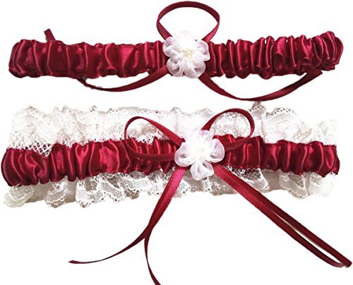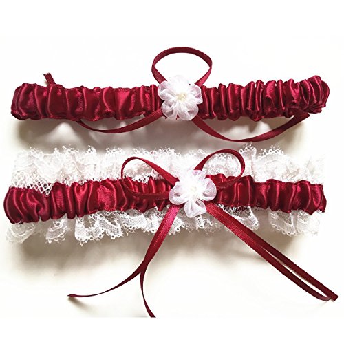 Women's Lace Wedding Garters Belt set for Bride Satin with Ribbon Tulle Flowers Bead Burgundy