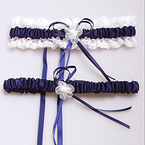 Women's Lace Wedding Garters Belt set for Bride Satin with Ribbon Tulle Flowers Bead Navy Blue