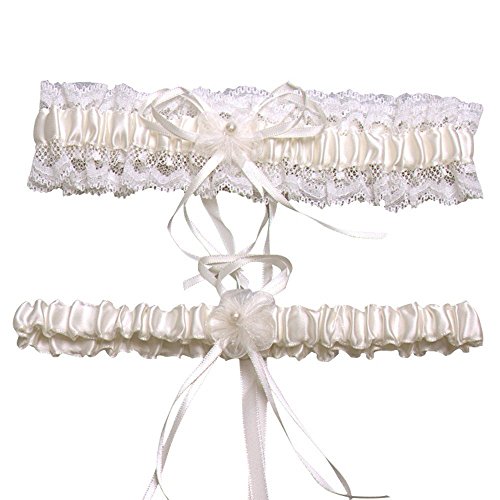 Women's Lace Wedding Garters Belt set for Bride Satin with Ribbon Tulle Flowers Bead Beige
