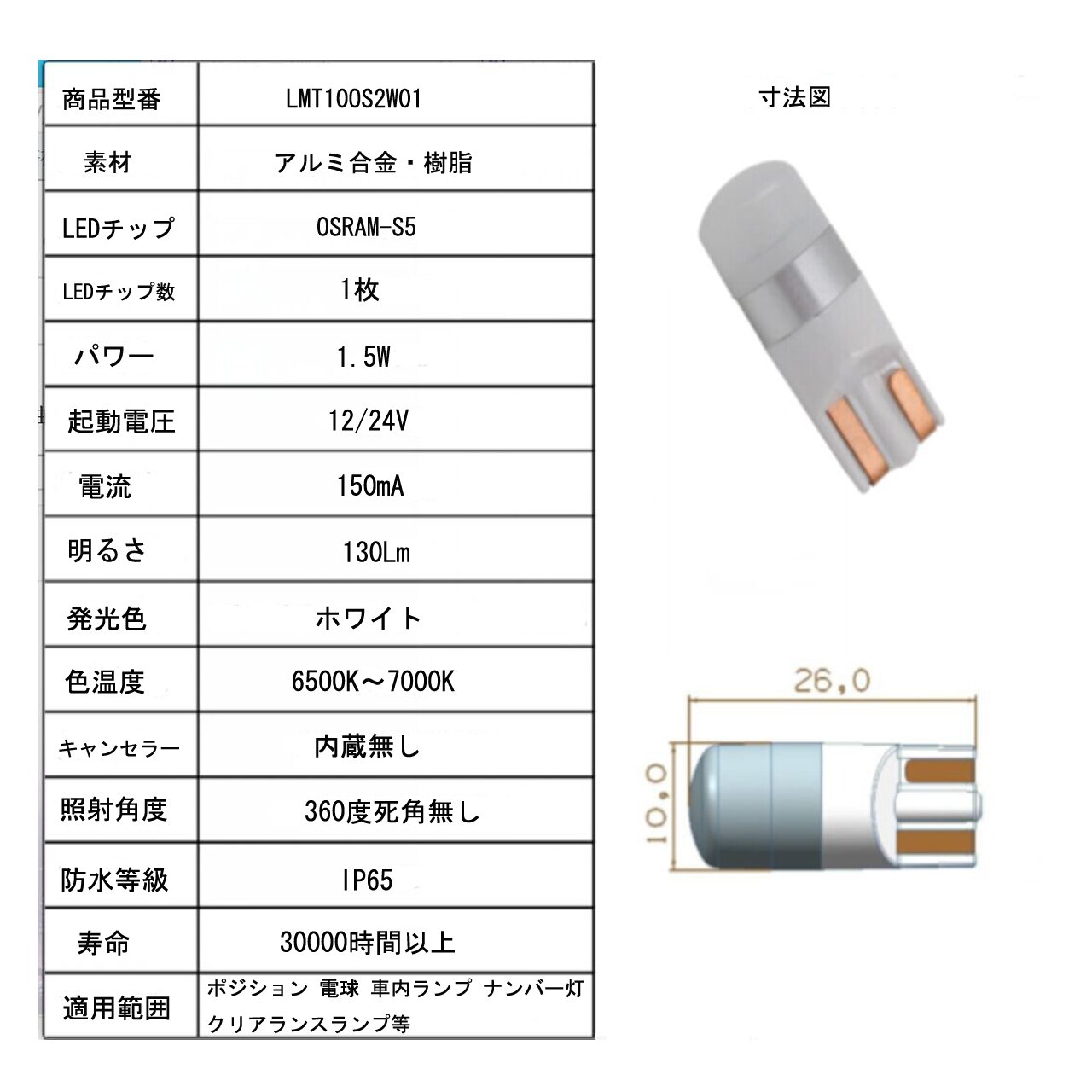 Soft white light ■ 360 ° irradiation Homogeneous light distribution ■ Designed exclusively for domestic cars ■ Guaranteed 90-day warranty ■ Manufacturer Part No.: LMT100S2W01 ■ Type: T10 ■ Quantity: 2 pieces ■ Rating: 12V 1.5W 150mA ■ Color temperature