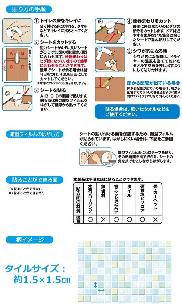 | トイレの床の表面を、汚れやキズから守りたい!!そんな願いから生まれた商品です。のりを使用しておりませんので、簡単に貼ってキレイにはがせます。貼りやすいようにシートを4分割してあります。防水ですので、濡れてもサッと拭きとるだけでお手入れラクチン♪ |