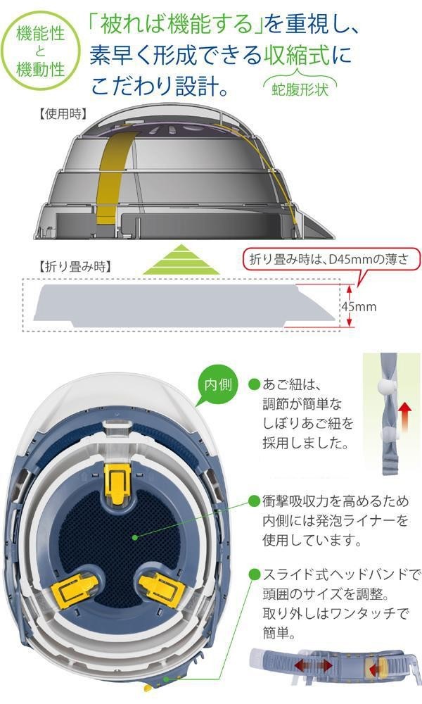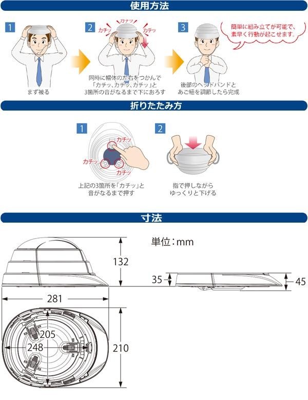 飛来落下物用の国家検定を取得した収納式防災用ヘルメットです。A4サイズ且つ薄さは45mmなので、場所を取らず収納でき、コンパクトで持ち運びに便利なサイズです。 |