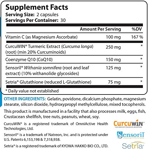 Our supplement formulation contains ingredients extremely effective for decelerating the cellular aging process, including Turmeric (as CurcuWIN), Sensoril, Setria reduced Glutathione, CoQ10, and a buffered form of Vitamin C.