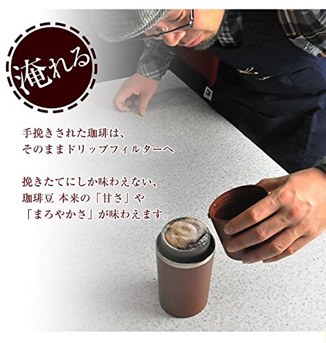 挽かれた豆は、ミルの下の、ペーパーレスフィルターに落ちます。ミル部分を取り外し、上部カップにお湯を入れて、ゆっくりとお湯を注ぎます。 挽きたて入れたてのドリップコーヒーがボトルに注がれます。
