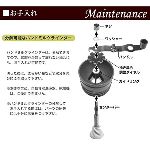 上部カップを外し、ミルのハンドルを展開し、コーヒー豆を挽きます。豆への加熱を防ぎ、風味豊かなコーヒーを演出するには手挽きが一番。