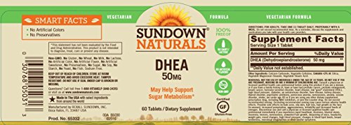 Sundown Naturals DHEA is a substance naturally produced within the body. As we age, circulating levels of DHEA may decline in both men and women. A study published in the highly respected Journal of the American Medical Association found that supplementation with 50 mg of DHEA per day in mature adults helped promote sugar metabolism.* Just one vegetarian-friendly tablet a day provides you with 50 mg of DHEA.Feature