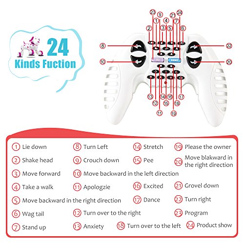 Functions: Turn left / right, move backward in the left / right direction, shake head, move backward and shake head, wag tail, lie down, take a walk, stand up, crouch, grovel down, apologize, please the owner, turn over to the left / right and revert, pee, anxiety, stretch, excited, dance, program, demonstration