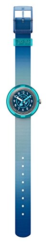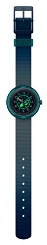 Flik Flak Go For Space Blue Dial Nylon Strap Unisex Watch ZFPNP025. 32 mm blue plastic case with a blue dial, a plastic crystal, turquoise and white hands, and white Arabic numeral hour markers. Minute markers around the rim. Logo beneath the 12 o'clock position. Features: shock resistant, machine washable, BPA free, and glow in the dark rocket and stars on the inner dial. Hands: hours, minutes, and seconds. Case thickness of 9 mm. Push / pull crown. 14 mm blue nylon strap with a buckle clasp. Quartz movement and water resistant up to 30 meters. Style: casual watches. Go For Space series.Feature