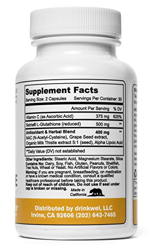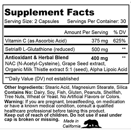 Ingredients: Vitamin C (as Ascorbic Acid) (625% D.V.), Setria L-Glutathione (reduced), NAC (N-Acetyl-Cysteine), Grape Seed extract, Organic Milk Thistle Extract 80% Silymarin (seed), Alpha Lipoic Acid