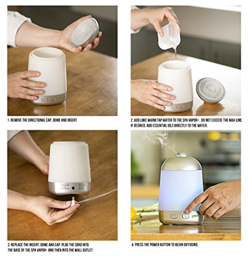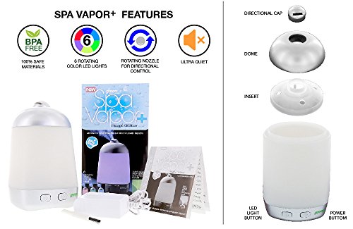 Spa Vapor - Advanced Wellness - Instant Healthful Mist Therapy (add essential oils for instant results) - Ultrasonic pulsating sound creates a soothing healing vapor - add essential oils for aromatherapy benefit - rotating LED lights change colors for beautiful glow - lights can be turned on/off - auto shutoff - uses normal tap water. Spa Vapor + ultrasonic oil diffuser This patented ultrasonic oil diffuser uses the industry's leading technology to create an ultrafine mist which will allow for all grades of essential oils to be suspended in the air for longer periods of time and for better inhalation. Six rotating LED lights create a soft soothing color changing effect - note - these lights can be turned on or off. Other features: · BPA free · Size 4" x 4" x 6" · Water capacity - 175ml · Room size - up to 500 square feet · Run time: Up to 5 hours · Auto shut off when the unit runs out of water · Directional misting Product usage procedures/tips Do: Use regular WARM tap water for optimum usage Fill half way to fill line to begin add more water after misting begins. Use a separate cup (not provided) to fill your unit with water. Make sure all 3 top parts are in place for unit to properly mist. Do NOT Do not use cold water (this will delay misting) Do not use distilled water (distilled water does not have minerals) Do not overfill - remove some water if unit does not mist Do not allow water to enter vapor hole on side of unit.Feature