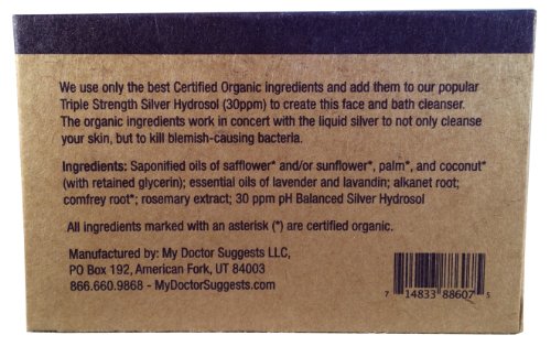 -. Binding : Misc. -. Brand : My Doctor Sests -. Feature : Made with 30ppm Silver Hydrosol Solution / Made with Certified Organic Ingredients / Mild Oatmeal Spice Scent / Exfoliating Face and Body Cleansing Bar / Kills Blemish Causing Bacteria - Recommended by Health Professionals -. PackageQuantity : 1 -. ProductGroup : Beauty -. ProductTypeName : BEAUTY -. Title : Organic Silver Soap - Made with Certified Organic Ingredients. Silver Infused Soap to Cleanse Skin & Kill Bacteria. 4oz Bar