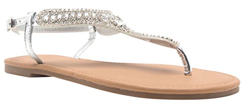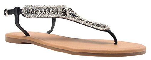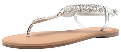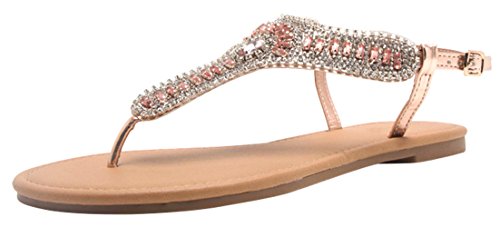 Product DescriptionThis flat sandal features a t-strap thong silhouette, buckled slingback strap, and crystal rhinestone beading. Imported.0