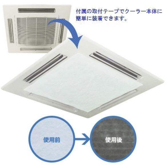 業務用エアコンは稼働時間が長く、天井などに設置されているため、お掃除も大変です。「業務用エアコンフィルター」は、エアコンの吸気口に貼り付けるだけで、花粉の吸着、防汚・防臭・空気清浄効果を発揮して掃除の手間を減らすことができます。一般的な天井吊り下げ式の業務用のエアコンの吸気口サイズにカットしてあるので取り付けも簡単です。 |