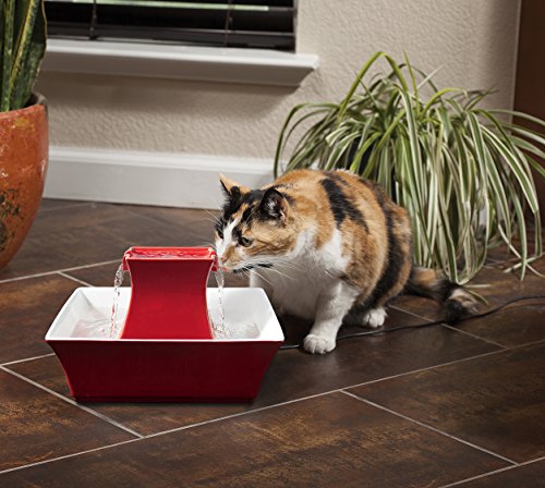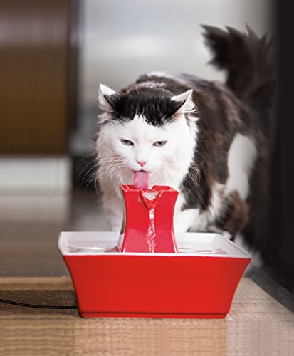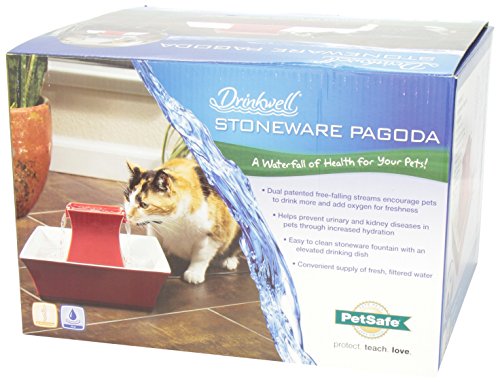 -. Binding : Misc. -. Brand : PetSafe -. Feature : Dog or cat water fountain features free-falling streams that encourage your pet to drink more / Includes charcoal filter that removes bad taste and odors / Lovely porcelain design is more hygienic, easy to clean and looks great in your home / Circulating cat drinking fountain keeps water much fresher than standing bowl water / Upper and lower dish provides two drinking areas for pets -. Label : PetSafe -. Manufacturer : PetSafe -. Model : 37013907-Parent -. MPN : 37013907-Parent -. PackageQuantity : 1 -. PartNumber : 37013907-Parent -. ProductGroup : Pet Products -. ProductTypeName : PET_SUPPLIES -. Publisher : PetSafe -. Studio : PetSafe -. Title : PetSafe Drinkwell Ceramic Pagoda Fountain for Pets