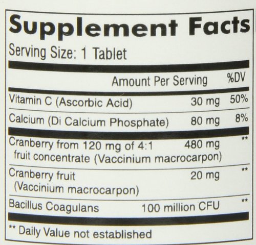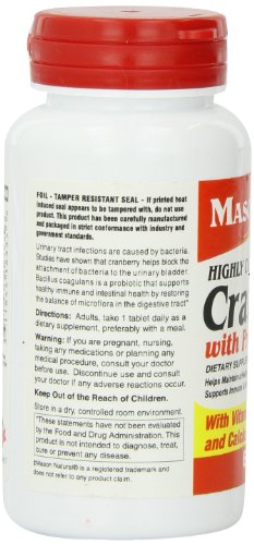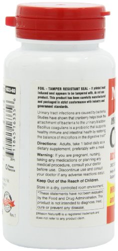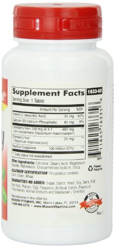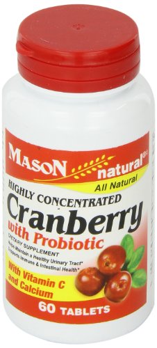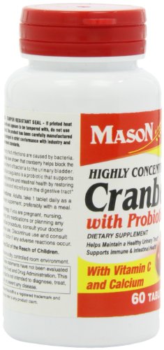 -. Binding : Health and Beauty -. Brand : Mason Vitamins -. EAN : 0311845163356 -. Feature : Urinary tract infections are caused by bacteria / Bacillus coagulans is a probiotic that supports a healthy immune and intestial health by restoring the balance of microflora in the digestive tract / These tart red berries may help prevent urinary tract infections and may also help cure them / Warning: Not intended for use by prgnant or nursing women. If you are taking any medications,planning any medical procedure or have hypercalcemia,consult your doctor before use. -. IsAdultProduct : 0 -. Label : Mason Vitamins -. Manufacturer : Mason Vitamins -. MPN : 1840974 -. NumberOfItems : 1 -. PackageQuantity : 1 -. PartNumber : 1840974 -. ProductGroup : Health and Beauty -. ProductTypeName : HEALTH_PERSONAL_CARE -. PublicationDate : 2011-12-28 -. Publisher : Mason Vitamins -. ReleaseDate : 2012-01-17 -. Size : 60 Tablets -. Studio : Mason Vitamins -. Title : MASON vitamins cranberry with Probiotic and Added Vitamin C and Calcium Tablets, 60 Count -. UPC : 701341663113