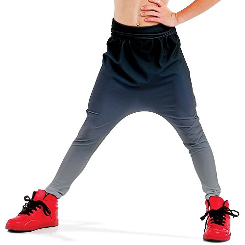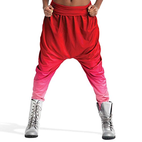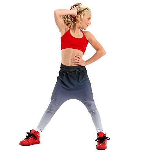 The Alexandra Collection girls ombre harem pant made of polyester spandex features a fold over waistband for comfort and support. The harem pant is available in Red, Black, and Royal.