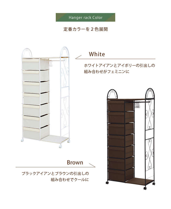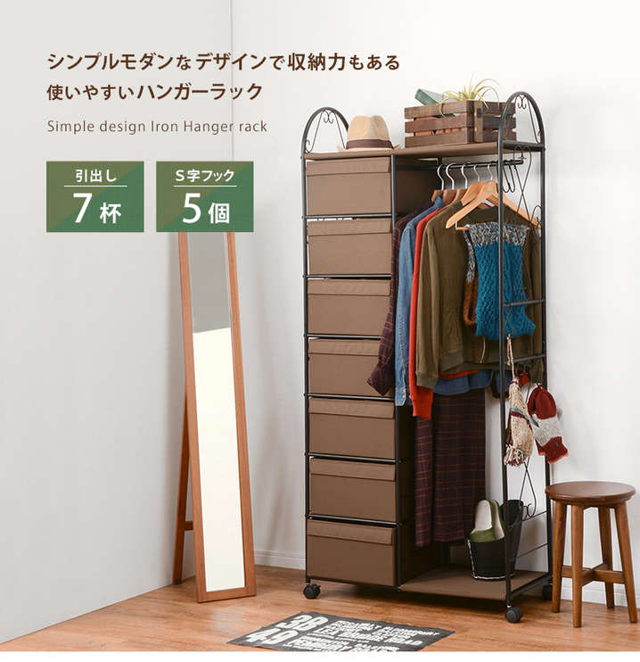 ●アイアンの曲線がエレガント、衣類や帽子・小物類も美しく収納できるハンガーラック。
