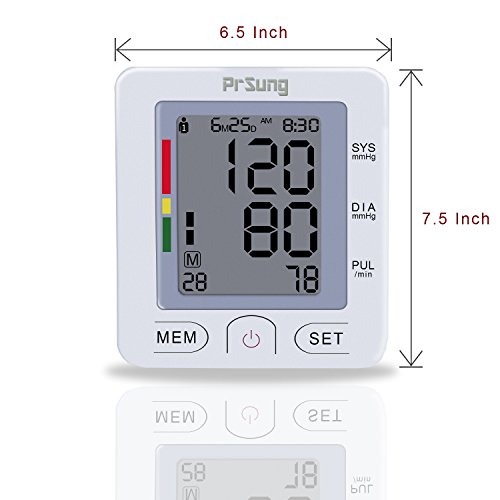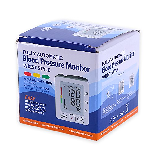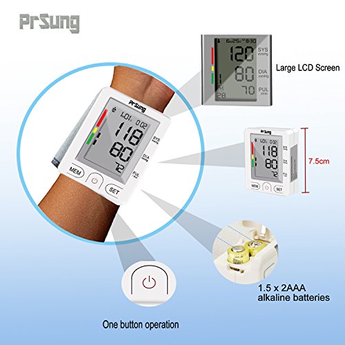 Studio : PrSung Publisher : PrSung Binding : Health and Beauty Product Description Using steps: 1. Please remain quiet for 5-10 minutes, and in a comfortable, relaxing position. Avoid eating, drinking, smoking, taking exercise and taking a bath before taking measurements. 2. Remove watches or other ornaments from a measured wrist (usually a left wrist). 3. Measure regularly every day. 4. Please rest for 3 to 5 minutes before the next measurement. About product: Automatic shutdown: 3 minutes Measuring position: wrist Measuring range: pressure 0-229 mmHg (0-39.9kpa), pulse 40-199pulse / min Accuracy: pressure 3 mm Hg ( 0.4kpa), reading 5% pulse. Wrist circumference: 135 ~ 195 mm (approx.). Host life: normal use in 10000 times. Battery life: normally 300 times. Matters needing attention: 1. We don't recommend blood pressure monitors for children under 12 years of age. 2. We recommend that people over the age of 60 use upper arm blood pressure monitors rather than wrist blood pressure monitors. 3. If you must stop measuring in any case, just press the start / stop button, then the airbag will release the air immediately. 4. Please follow the instructions "User Menual". 5. The best measurement time is when you get up, 2 to 3 hours, you measure, or when you calm down, please do not measure after strenuous exercise. Keep a good mood before use!