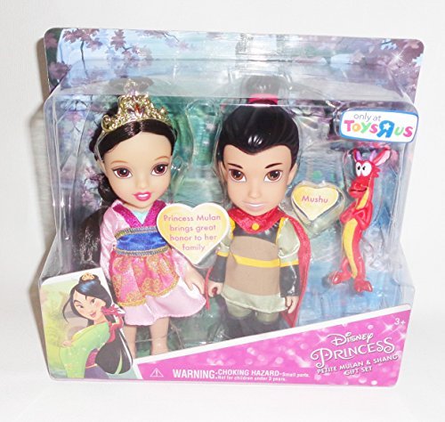 Includes: 2-Petite 6 inch Toddler Dolls (Mulan & Shang), 1-Mushu Figure, 1-Tiara, 1-Pair of Shoes & 1- Pair of Boots