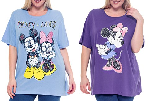 Two-pack of Disney plus size t-shirts - one with Minnie Mouse and one with Mickey & Minnie Mouse - officially licensed. The Mickey and Minnie print has pink glitter accents. Soft, thin, lightweight fabric. Machine wash cold with similar colors, inside out. Tumble dry low and remove promptly. Do not iron decoration.Feature