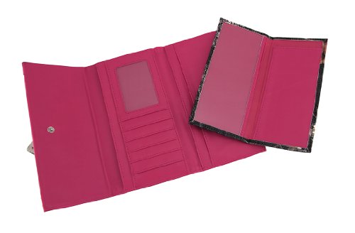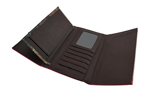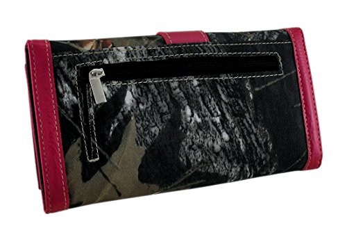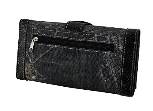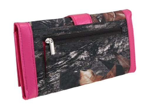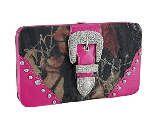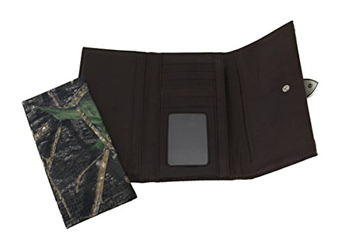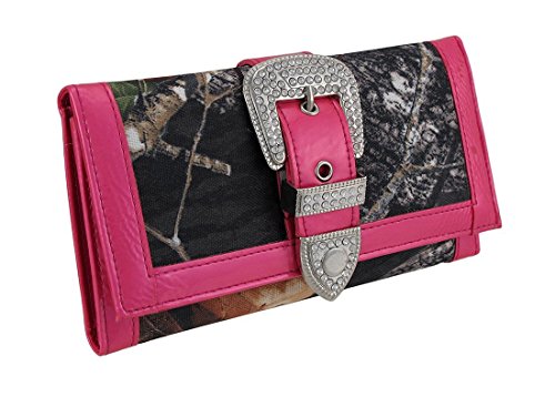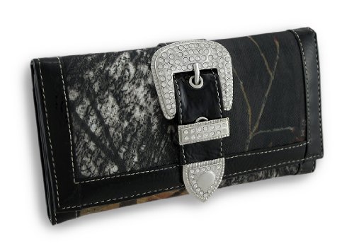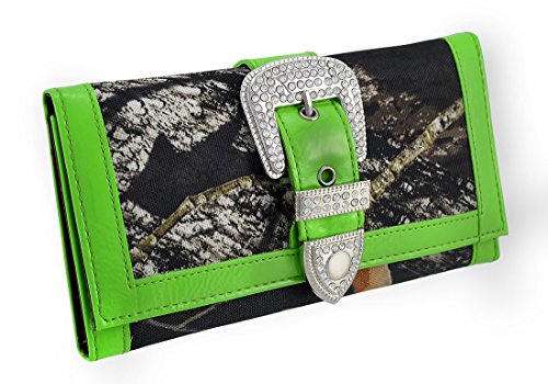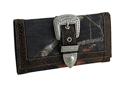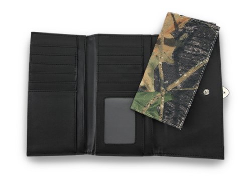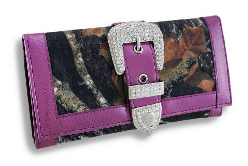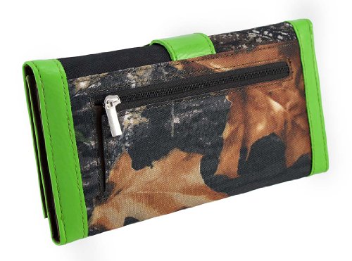 Studio : Zeckos Publisher : Zeckos Product Description This nylon canvas wallet features a forest camouflage print, vinyl trim, and a sparkling rhinestone buckle. It measures 7 1/2 inches long, 4 inches tall, and secures with a snap. The wallet opens up to reveal 5 credit card slots, a window view ID slot, a removable checkbook cover, and 2 slip pockets for cash, receipts, and business cards. There is also a zipper compartment on the back of the wallet for loose change. It is sure to be admired, and makes a great gift for a friend. 0