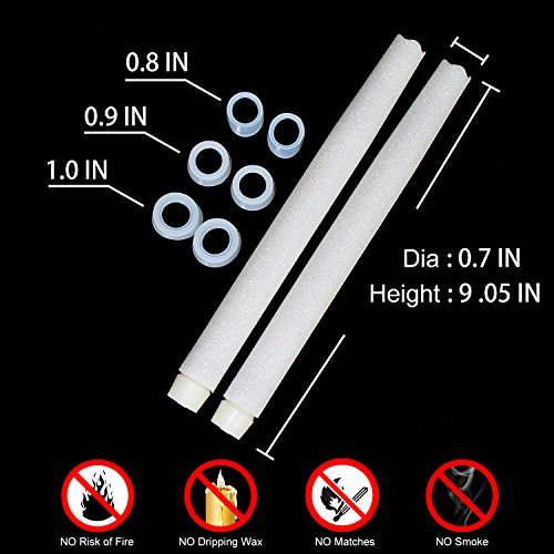 SPECIFICATIONS - -Candle size 9 inches High. Set of 2. Include 3 kinds of different sizes silicon rings for fitting different sizes of candle holder ,run on 2 times AA batteries (not included) .Features Push buttom switch.