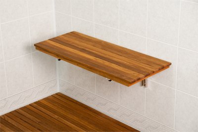 Studio : Teakworks4u Publisher : Teakworks4u Product Description A sturdy construction and inherent elegance of teak define the Wall Mount Fold Down Bench. Perfect for the shower, steam room or sauna, this bench seat is naturally mold and mildew resistant due to the wood's antimicrobial properties. The shower bench locks in the lifted position and easily folds away when not in use. Stainless steel brackets are rated for 300 lbs and must be installed into studs or a wall backing. All mounting hardware is included. Proudly made in the U.S.A. of quality teak and stainless steel. Custom sizes are available as well, please contact Teakworks4u 0