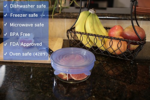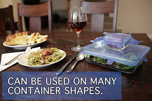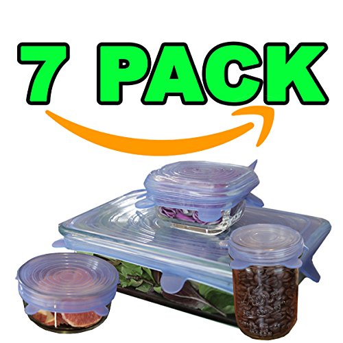 Silicone Stretch Lids 7 pack, silicone lids, includes EXCLUSIVE XL SIZE, fits square and round containers. Approved for use in the dishwasher, microwave and freezer. Rated -40ºF to 428ºF. BPA FREE.
