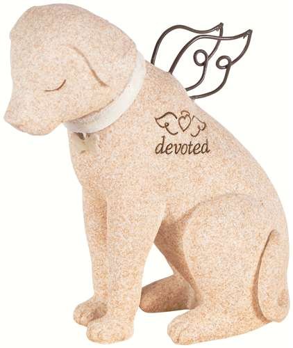 - Angel wings and "devoted" adorn the dog figure