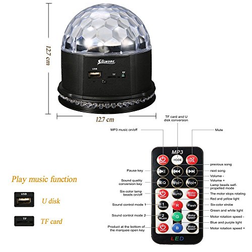 ★【 MUSIC PLAYER】USB stick and TF card. Special MP3 playback function,Inserted USB stick (Memory:3MB,The U disk of product only for test,) to the The Disco Crystal Magic Ball light. you can freely play your favorite songs, high-quality music enjoyment will make you very happy.With wireless remote control, easy to use. A variety of modes, a variety of color switching only need to gently press the button can you choose the desired, but also free to ON/OFF without the need to disconnect the power.