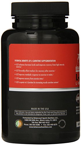 -. Binding : Health and Beauty -. Brand : Betancourt Nutrition -. EAN : 0857487003549 -. Feature : Free form amino acids for a higher absorption rate / Nitrogen balance / Lean muscle / Muscle repair / Promote muscle growth and reduce muscle wasting -. IsAdultProduct : 0 -. Label : Betancourt Nutrition -. LegalDisclaimer : If you are pregnant, nursing or taking any medications, consult your doctor before use. Discontinue use and consult your doctor if any adverse reactions occur. L-Carnitine L-Tartrate is manufactured in an NSF certified cGMP facility in Miami, Florida. This ensures that our facilities comply with all Food and Drug Administration regulations and requirements for the manufacturing of nutritional supplements. Keep out of reach of children. Store in a dry cool place. -. Manufacturer : Betancourt Nutrition -. Model : 4270100 -. MPN : 4270100 -. NumberOfItems : 1 -. PackageQuantity : 1 -. PartNumber : 4270100 -. ProductGroup : Health and Beauty -. ProductTypeName : HEALTH_PERSONAL_CARE -. PublicationDate : 2013-01-24 -. Publisher : Betancourt Nutrition -. ReleaseDate : 2013-01-01 -. Size : 60 count -. SKU : 4270100 -. Studio : Betancourt Nutrition -. Title : Betancourt Nutrition L-Carnitine 60 Capsules -. UPC : 857487003549